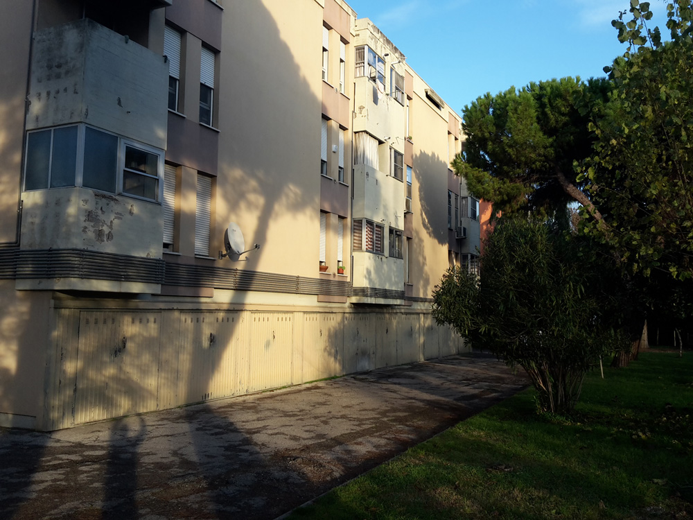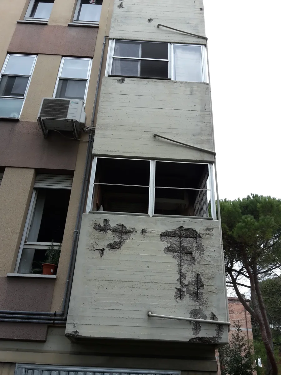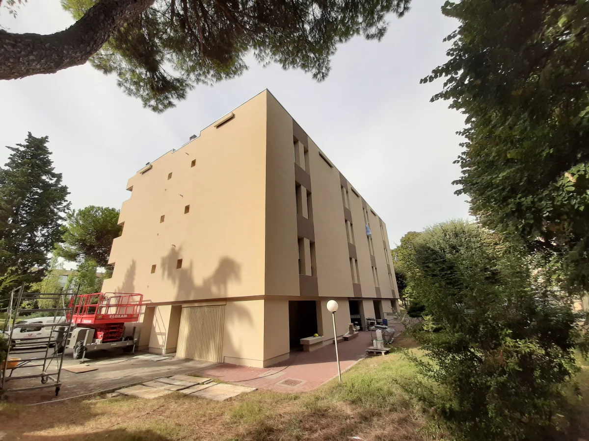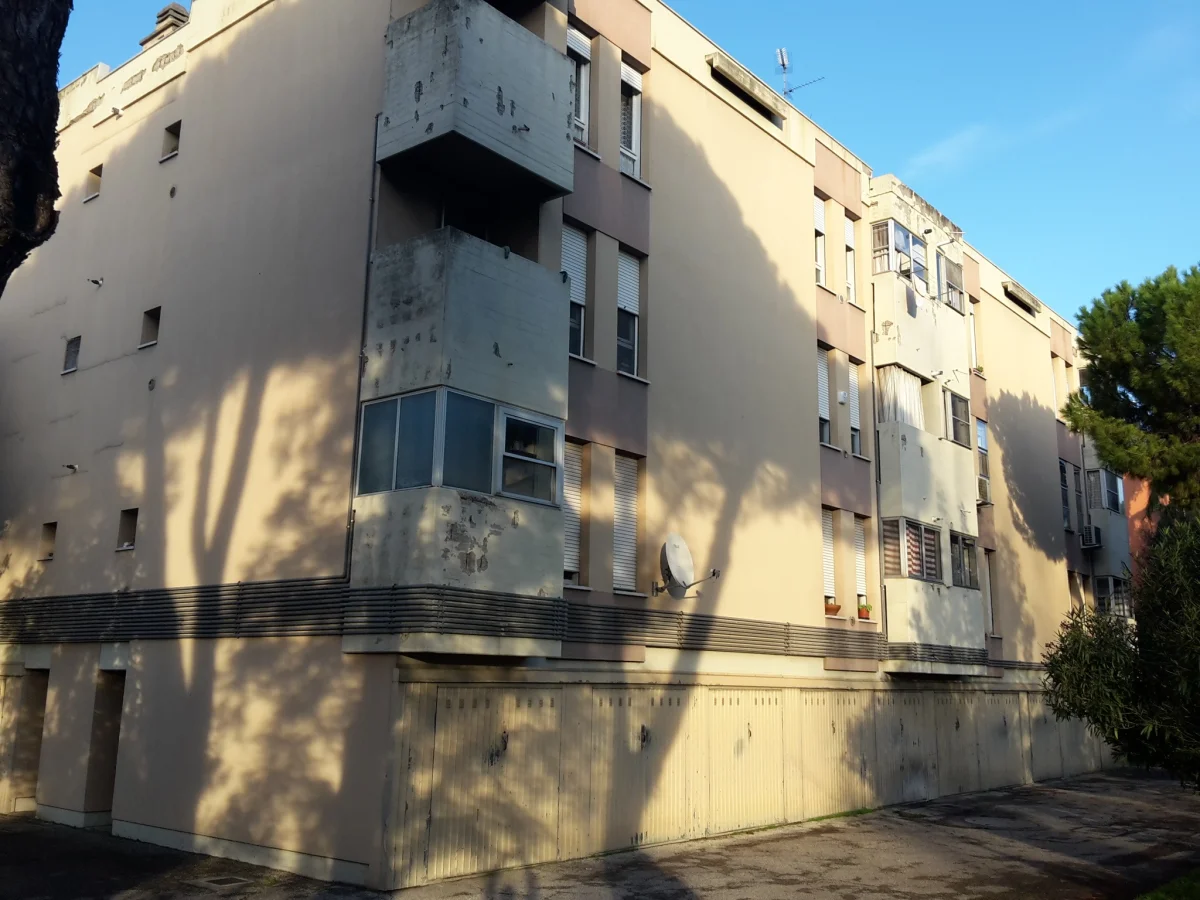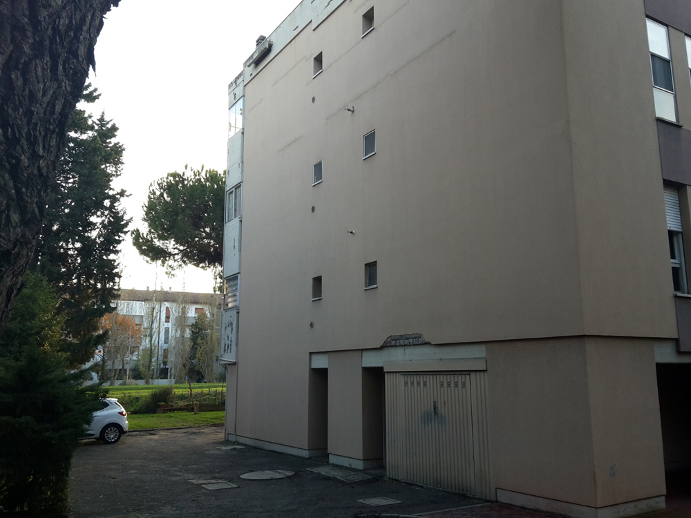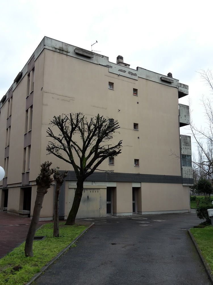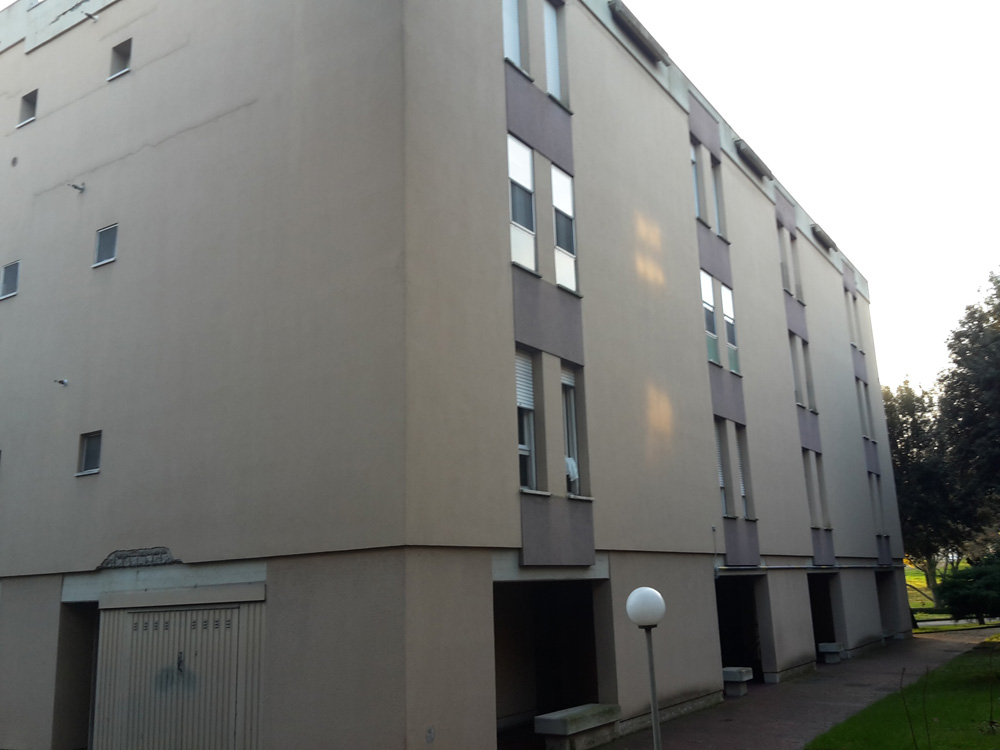 L’edificio costruito nell’anno 1976, orientato lungo l’asse EST-OVEST, si sviluppa su quattro piani fuori terra il primo dei quali adibito a cantine/garages. La struttura è in telaio in cemento armato e il tamponamento esterno è realizzato in laterizio (spessore parete 32 cm). I serramenti ante intervento erano in legno e vetro singolo con oscuranti costituiti da tapparelle il cui cassonetto non è isolato. Il coperto in latero-cemento, piano, isolato con 5 cm di lana di roccia e debolmente ventilato (intercapedine d’aria di 5-6 cm).