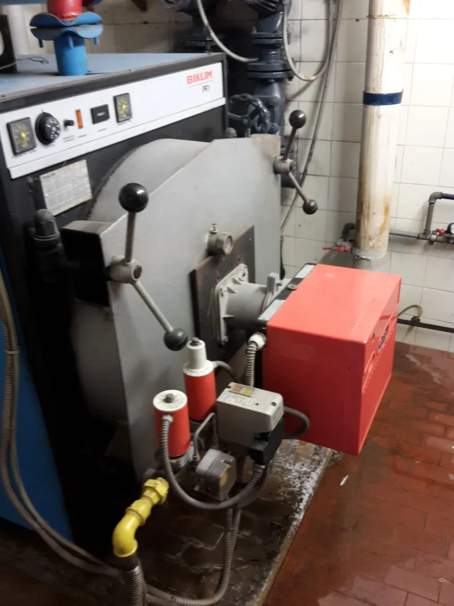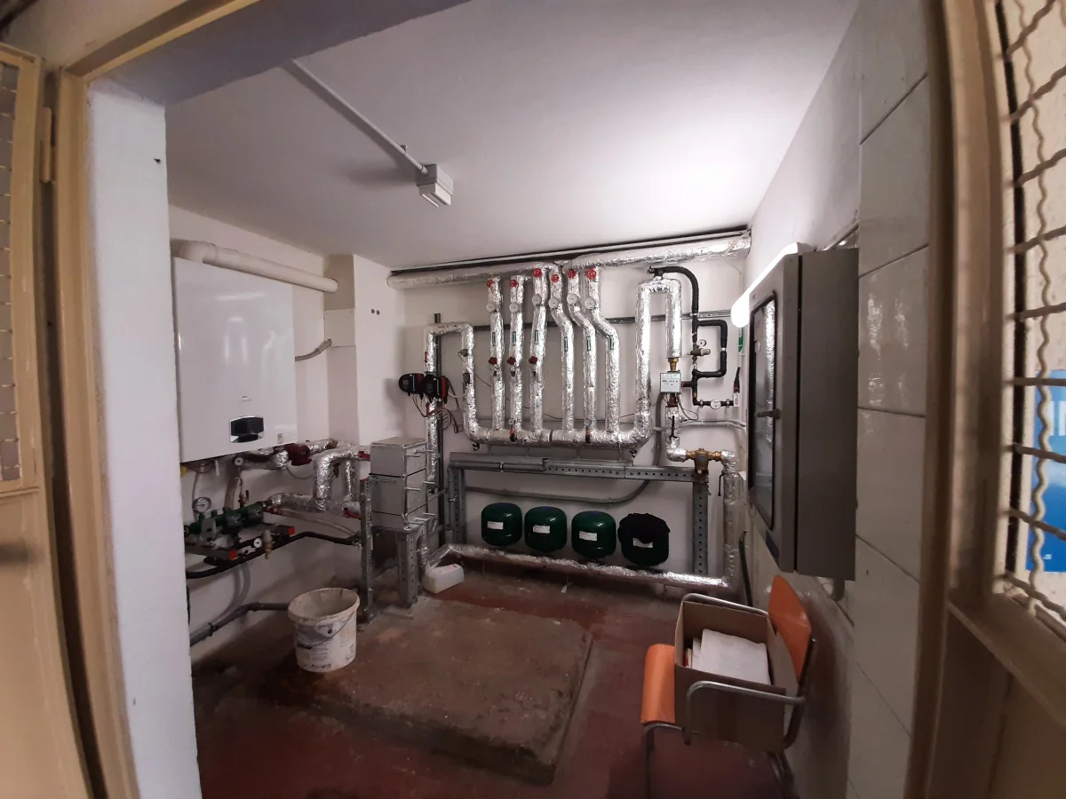 L’impianto di riscaldamento è centralizzato; il generatore di calore ante intervento era una caldaia a basamento installata nel 1990, alimentata a gas metano della potenza al focolare nominale pari a 167 kW, con bruciatore tradizionale ad aria soffiata. La distribuzione a colonne montanti debolmente coibentate alimenta un sistema di emissione costituito da radiatori a colonna in tubi di acciaio, la cui regolazione è affidata a valvole termostatiche. La contabilizzazione del calore è ottenuta mediante ripartitori.